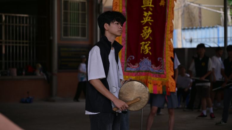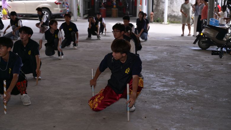 義勝興英歌隊的演出現場,隨著一聲震天鼓響,少年們手持紅漆英歌槌騰躍而出。“猛虎下山”的陣型氣勢如虹,彩旗翻飛間,剛勁動作與年輕面龐形成強烈反差,瞬間點燃現場氛圍。