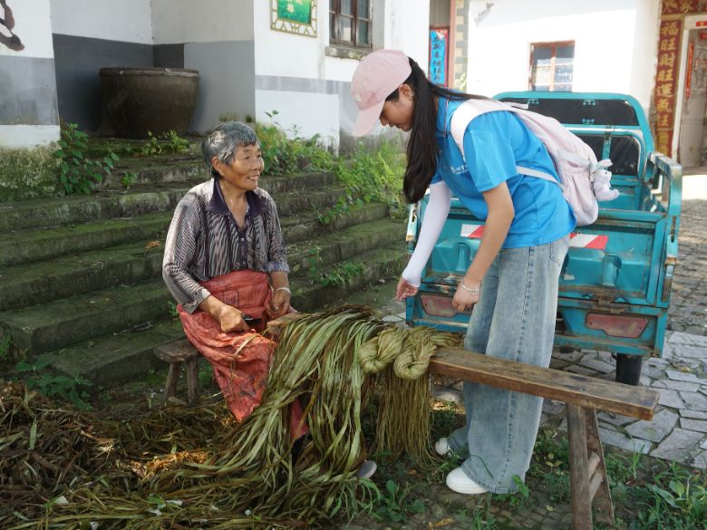 實(shí)踐團(tuán)抵達(dá)汪橋村后,與村委會(huì)迅速對(duì)接,在團(tuán)委書(shū)記汪靜引領(lǐng)下走進(jìn)村史館開(kāi)展紅色研學(xué)。館內(nèi)抗戰(zhàn)水壺、英雄勛章等文物,搭配展現(xiàn)巢北抗戰(zhàn)歷史的展板與“英雄柳”“大廟橋小學(xué)”等故事講解,讓成員們深刻感悟革命先輩英勇,堅(jiān)定理想信念。走出村史館,眾人在“英雄柳”下聆聽(tīng)群眾抗日故事,深受家國(guó)情懷觸動(dòng)。在了解紅色歷史后,實(shí)踐團(tuán)深入鄉(xiāng)村產(chǎn)業(yè)與非遺傳承場(chǎng)景。在茶干廠,成員觀摩了泡豆、磨漿到點(diǎn)鹵成型的傳統(tǒng)豆腐制作工藝,每道工序都凝結(jié)著村民的匠心;偶遇手工搓麻繩的老人時(shí),大家圍聚聆聽(tīng),從翻飛的麻線中體悟手工技藝的歲月故事。最后,實(shí)踐團(tuán)走進(jìn)碧根果種植園,通過(guò)發(fā)放問(wèn)卷收集村民對(duì)產(chǎn)業(yè)發(fā)展的建議;在菌菇培育基地,現(xiàn)代農(nóng)業(yè)種植技術(shù)的創(chuàng)新與高效,為成員們探索鄉(xiāng)村振興路徑提供了新思路。