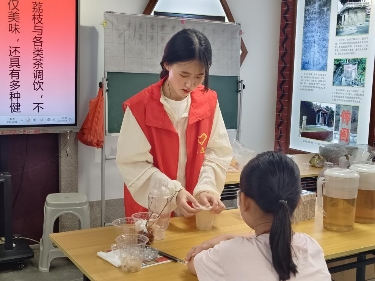 荔香入盞,茶韻潤(rùn)心:創(chuàng)新課堂啟文化之旅 在首次茶藝課上,實(shí)踐隊(duì)隊(duì)員宋曉瑤結(jié)合蓬萊鎮(zhèn)當(dāng)?shù)靥厣幕I備了荔枝與茶調(diào)飲課程。她在上課前便及時(shí)準(zhǔn)備好精美的課件、新鮮的材料和優(yōu)質(zhì)的器具,力求做到內(nèi)容豐富、形式美觀,能夠吸引學(xué)生們的注意力,激發(fā)他們的學(xué)習(xí)興趣。課堂上,她詳細(xì)講解了荔枝與茶搭配的原理和技巧,從荔枝的挑選、處理,到茶葉的沖泡、調(diào)配,每一個(gè)環(huán)節(jié)都耐心示范。學(xué)生們聽后紛紛動(dòng)手嘗試,調(diào)制出了一杯杯獨(dú)具風(fēng)味的荔枝茶飲。這堂課不僅讓學(xué)生們學(xué)會(huì)了如何調(diào)制荔枝茶飲,更讓他們深入了解了茶文化的博大精深。