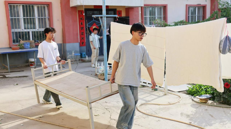 抵達村莊后,實踐團成員們迅速投入工作。他們手持掃帚、抹布,搬桌子、分組清掃各個死角衛生。