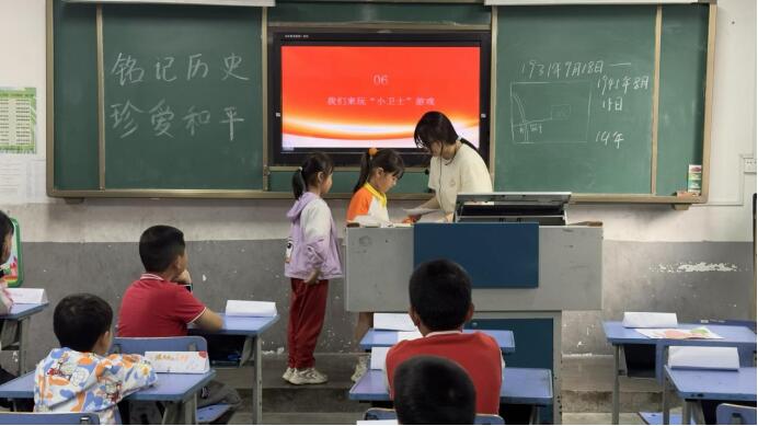 活動(dòng)中,通過講解事變經(jīng)過,呈現(xiàn)“日軍借口搜查”、“中國士兵拒敵”等情節(jié),隊(duì)員們提出的互動(dòng)問題引發(fā)孩子們的齊聲回應(yīng),現(xiàn)場氣氛熱烈。為加深理解,課堂設(shè)計(jì)了“保衛(wèi)宛平城”角色扮演游戲。孩子們分組扮演中國士兵、老百姓和日本軍官,重現(xiàn)歷史場景。“士兵”挺胸拒絕無理要求,“老百姓”齊聲吶喊守護(hù)家園。游戲結(jié)束后,支教隊(duì)員引導(dǎo)總結(jié):“對(duì)敵人說‘不行’是保護(hù)家園的第一步,只有團(tuán)結(jié)才能贏得勝利!”