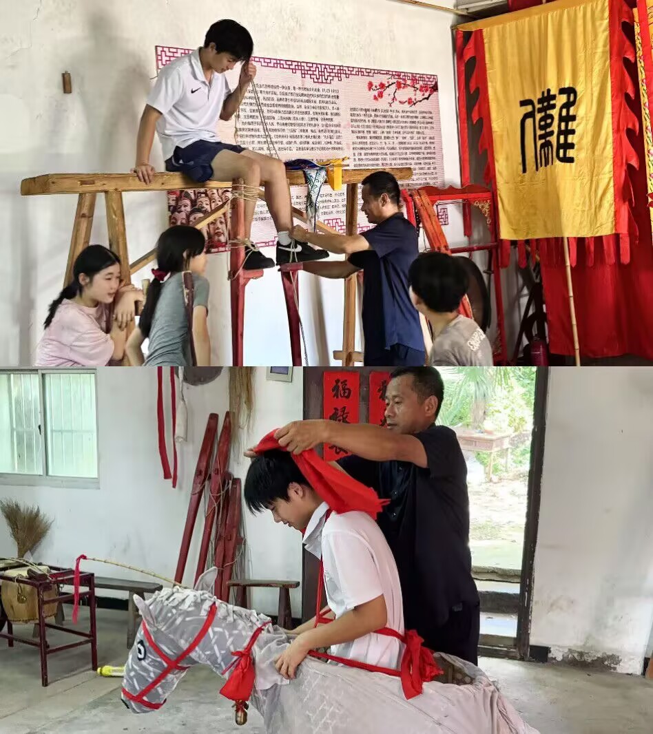 "看那個扎馬尾的小姑娘!"杜會長自豪地介紹,"她去年去了合肥,把儺戲唱給了上萬觀眾。"面具之下,孩子們化身魁星點斗,執筆勾勒祥瑞;扮作采花童子,舞步靈動似蝶。一招一式雖顯稚嫩,卻將儺戲的古樸韻味展現得淋漓盡致。為了更深入感受儺戲魅力,隊員們在孩子們的指導下穿上竹馬道具、拿起鼓槌、踩上高蹺。"原以為踩高蹺很簡單,沒想到既要保持平衡,還要配合唱腔和動作。"隊員摘下汗濕的頭巾感慨,"這些孩子太了不起了!"