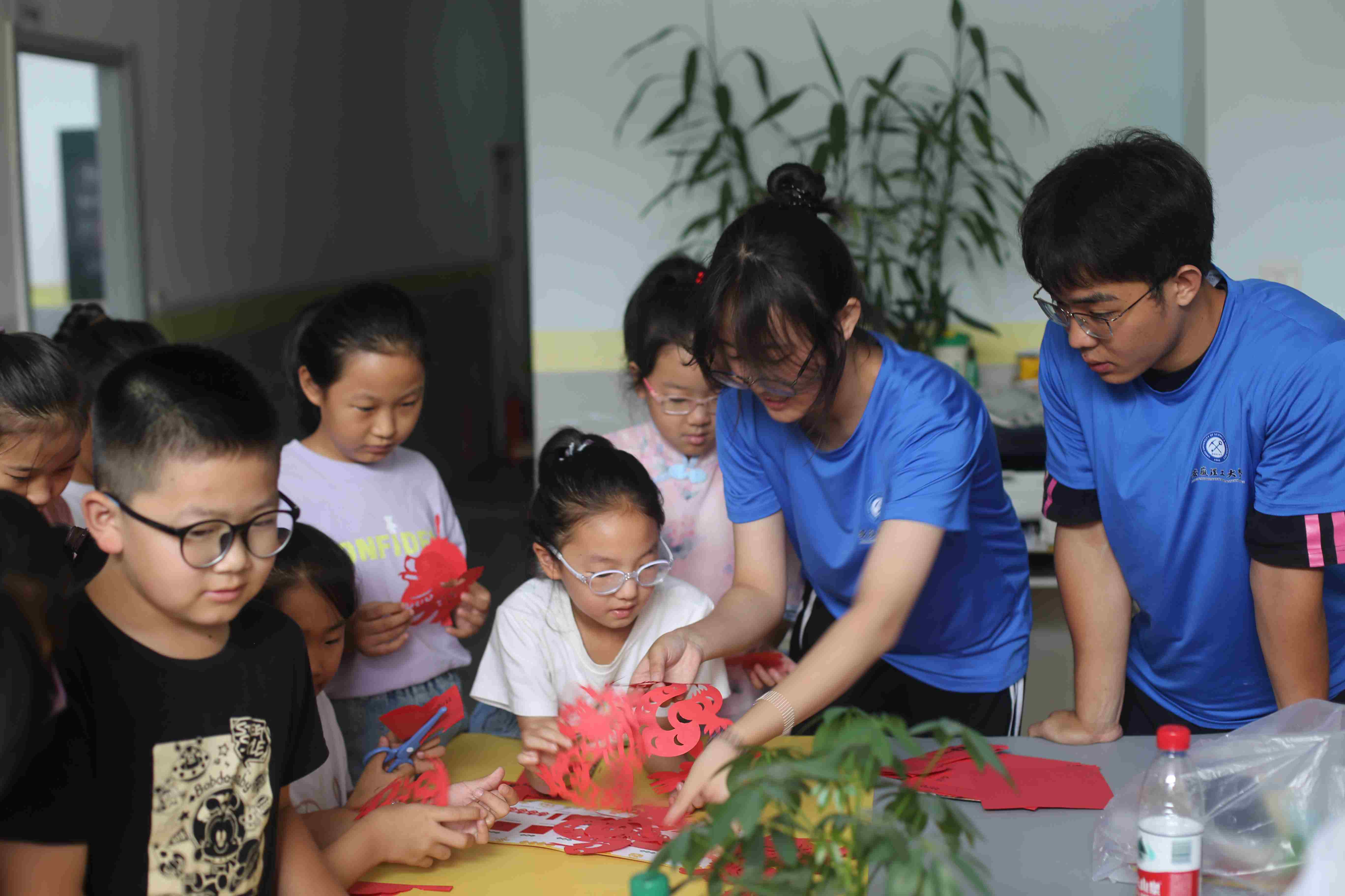 短暫的午休過后,社區活動室又換上了另一番“模樣”,非遺剪紙活動接力登場。活動室的桌子上整齊地擺放著紅紙、剪刀等工具,墻壁上還張貼著精美的剪紙作品,營造出濃厚的傳統文化氛圍。隊員們手持紅紙,耐心地向孩子們示范折剪技巧。從最簡單的對稱圖案開始,到逐漸復雜的創意造型,隊員們手把手地教,細致入微地講解每一個步驟。“先把紙對折,然后沿著這條線慢慢剪,注意不要剪到手哦。”溫柔的叮囑聲回蕩在活動室里。