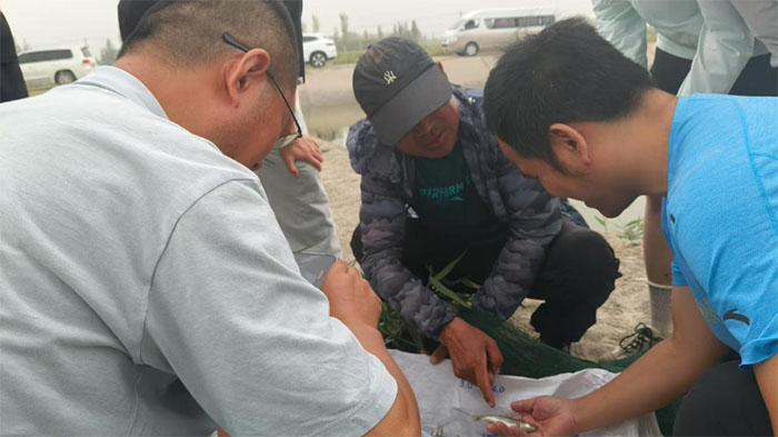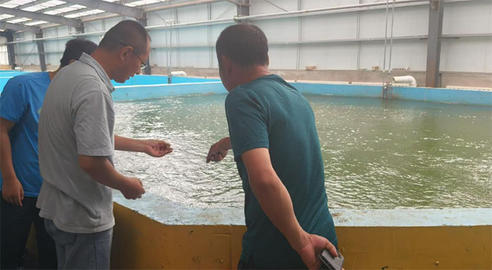 在十六團,指導老師實地察看了當地漁場的養(yǎng)殖環(huán)境、養(yǎng)殖品種及設施配備情況,與漁場負責人圍繞苗種培育、病害防治、生態(tài)養(yǎng)殖模式等關鍵技術展開深入交流,為漁場提質增效出謀劃策。