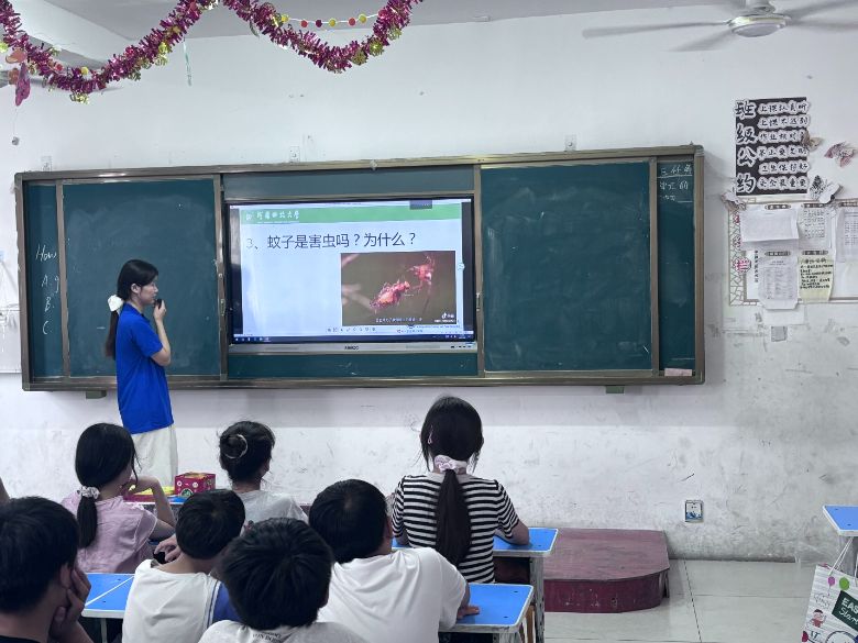 與此同時,昆蟲講解課在其他教室內有序進行。支教團成員結合專業知識,通過生動的圖片、有趣的短視頻和實物標本,向孩子們介紹了蝴蝶的變態發育、蜜蜂的社會結構、螳螂的捕食習性等知識。課堂上,志愿者們用通俗易懂的語言講解昆蟲與自然的關系,還設計了“昆蟲找找看”互動環節,鼓勵孩子們主動提問、積極思考。當看到色彩斑斕的蝴蝶標本時,孩子們紛紛湊近觀察,好奇地探究著蝴蝶翅膀的光澤奧秘與遷徙軌跡,志愿者們的耐心解答在孩子們心中播下探索自然的種子。