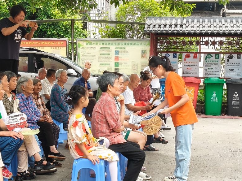 (圖為實踐團成員為建新居民分發(fā)禁毒宣傳單通訊員冉德華)