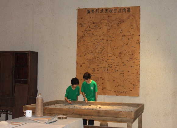 在掛有“蘇南抗日根據地形勢圖“的房間內,成員們俯身圍攏探討,將沙盤與地圖結合,深入了解蘇南抗日根據地戰略布局、斗爭歷程,探尋著革命先輩在溧水地區的戰斗足跡。祠堂內布滿灰塵的煤油燈,陶瓷杯,農具等,將成員們帶回到那段軍民同心、共御外侮的崢嶸歲月,生動詮釋了“依靠群眾、生死與共”的鋼鐵情誼。