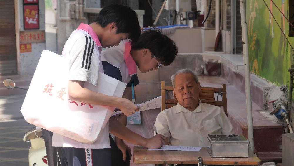下午2點30分,筑愛支隊自發(fā)分成多支小隊,穿梭于街坊巷里,以線下問卷的形式,調(diào)查云秀社區(qū)居民對養(yǎng)老需求的情況。