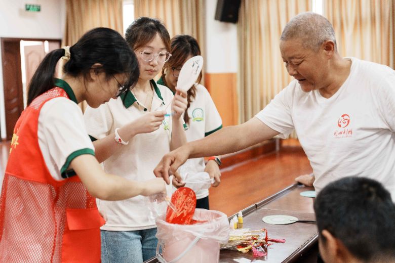 “心手相連,情暖夕陽”活動營造出歡樂互動氛圍。隊員提前備好漆扇工具,擺放整齊。面對老人好奇的目光,隊員們先展示成品,講述漆藝背后的非遺文化故事,“這些看似簡單的圖案,都是老一輩手藝人的智慧傳承”,喚起老人對傳統技藝的興趣。教學時,隊員們“手把手”指導,從漆扇的基礎顏色選擇,到漆扇上色的技巧,耐心拆解步驟。老人雖手腳不再靈便,動作稍顯遲緩,但在隊員協助下,慢慢選色、細細描繪,當一把把色彩斑斕的漆扇出爐,成就感在老人眼中閃爍,欣賞交織在交流聲、歡笑聲中。