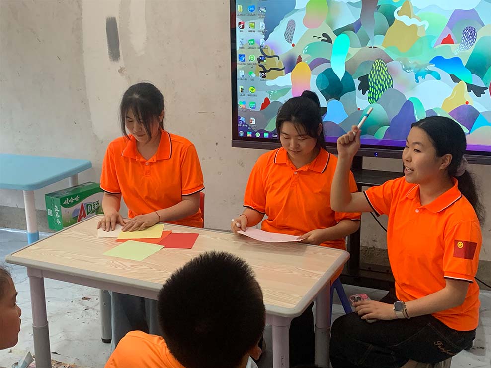 圖為團隊成員指導孩子們折紙并鼓勵他們進行涂鴉創作,陳禹帆攝