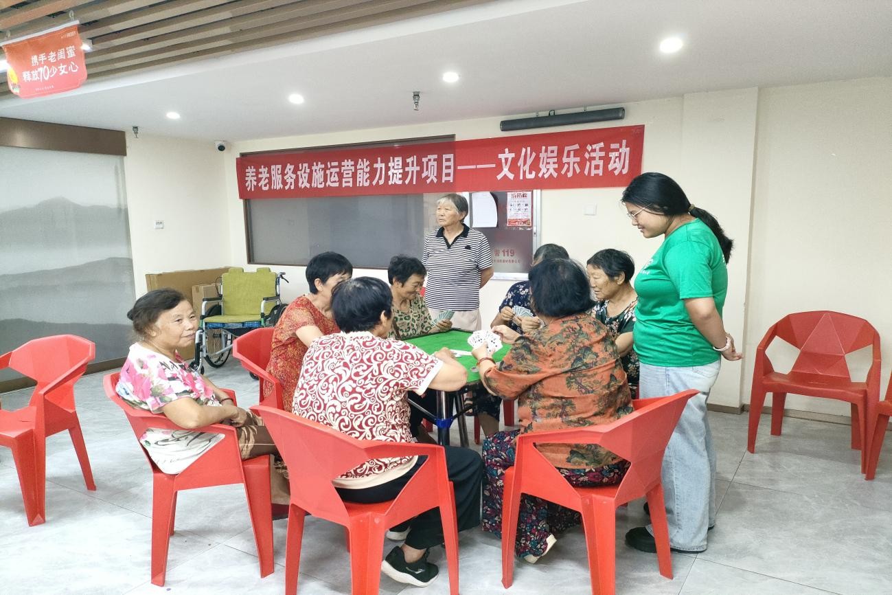 清潔工作結束后,成員們迅速融入老人們的日常休閑活動。在棋牌游戲的世界里,老人們肆意暢快、放松愉悅,一同分享日常生活趣事。小分隊在旁傾聽,饒有興致地觀看牌局,時不時參與討論,現場滿是輕松愉快的交談聲和陣陣笑聲。成員也隨機發起小采訪,聽不同的故事,感受他們過往的經歷,同時也分享自己在學校中發生的趣事,給爺爺奶奶們的生活注入了青春活力。交流中,成員為養老院帶來青春活力,老人們積極的生活態度也感染著在場的每一位團隊成員。