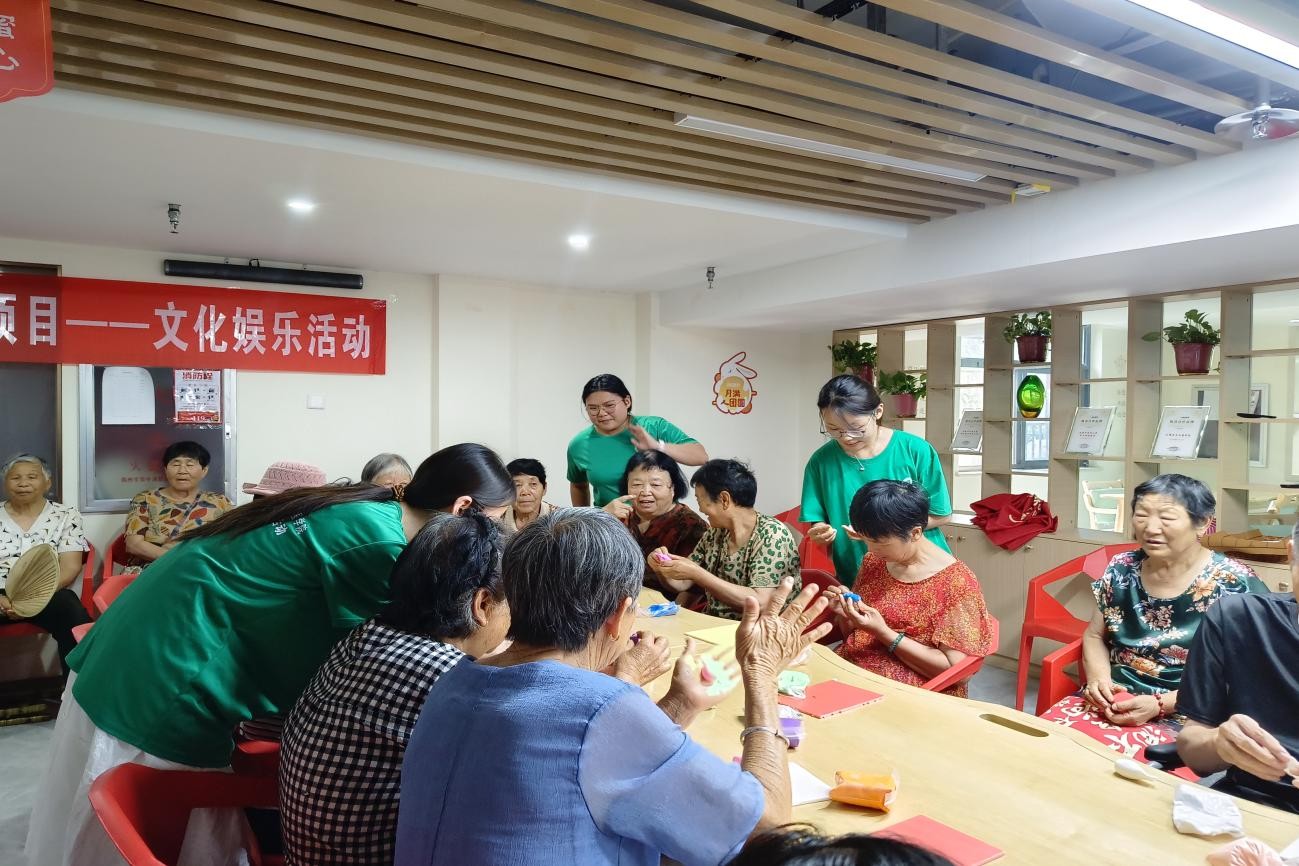 接下來,團隊成員組織老人們進行手工活動,大家提前備好多色粘土等材料,分組陪伴在老人身邊,共同參與手工制作。成員們坐在老人身旁,俯身貼近,用簡易的語言講解步驟,手把手地協助操作。他們不時輕聲鼓勵,細心調整材料位置,確保每位老人都能參與其中。老人們被年輕人的熱情和耐心所感染,臉上洋溢著快樂的笑容。
