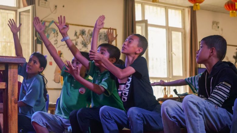 (圖為阿克蘇市友誼社區(qū)茶苑內(nèi)青少年舉手搶答)