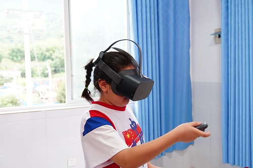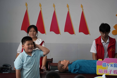 童心筑牢安全盾,數智點亮平安燈。團隊聚焦青少年安全素養提升,以VR技術賦能安全(生命)教育,讓場景“真”起來。孩子們通過沉浸式體驗地震逃生、消防隱患排查等真實場景,掌握應急避險技能。“伏地、遮擋、手抓牢”的口訣在耳邊回響,孩子們迅速找到三角區避險,親歷地震帶來的緊張氛圍。“這種學習方式像闖關游戲,我找到了所有隱患!”一名孩子興奮地展示自己的“電子勛章”。隨后,“技能+N數智小學堂”,通過心肺復蘇實訓、防溺水游戲、急救知識問答等形式,引導孩子們動手實踐,在人體模型上練習標準按壓動作;“沖脫泡蓋送”燙傷處理口訣融入“吹球過河”游戲中,使安全知識從理論認知轉化為行為本能。讓本領“強”起來,讓守護“實”起來,真正實現從“紙上談兵”到“實戰演練”的跨越。