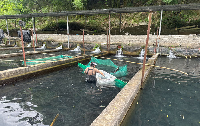 養(yǎng)殖場(chǎng)負(fù)責(zé)人向?qū)嵺`團(tuán)隊(duì)介紹,當(dāng)?shù)靥烊簧饺疁爻D旰愣,?萬尾中華鱘提供了接近野生的生長(zhǎng)環(huán)境。通過獨(dú)創(chuàng)的分級(jí)分池養(yǎng)殖模式,配合嚴(yán)格的日常巡查與病害防控措施,魚苗存活率穩(wěn)定在95%以上。目前,養(yǎng)殖場(chǎng)已建立“批發(fā)市場(chǎng)+酒店直供+旅游零售”三位一體的銷售網(wǎng)絡(luò),單條4-5斤規(guī)格的成魚零售價(jià)可達(dá)20元/斤。