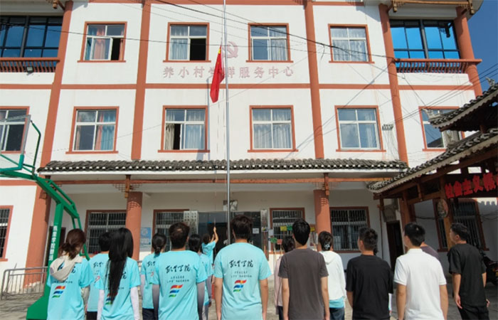 當日6時30分,廣場上紅旗飄揚,全體人員列隊整齊。隨著主持人宣布升旗儀式開始,兩名實踐團成員邁著鏗鏘步伐護送國旗走向旗桿,在場人員目光聚焦五星紅旗。國歌奏響,紅旗冉冉升起,全體人員肅立行注目禮,嘹亮的歌聲回蕩在鄉村上空,傳遞出對祖國的赤誠熱愛。