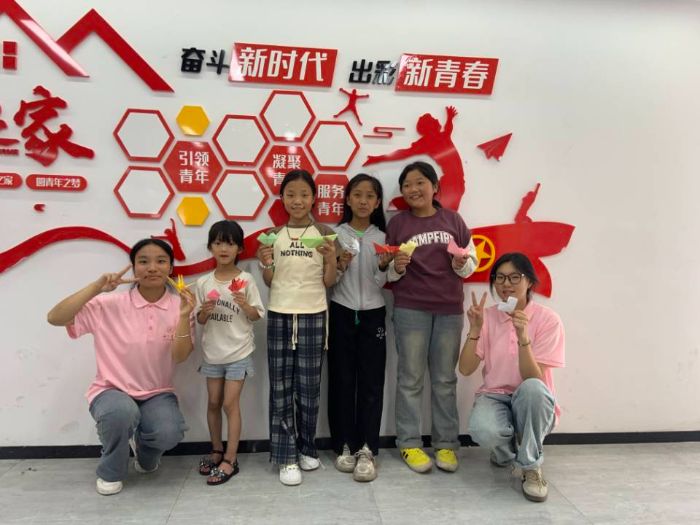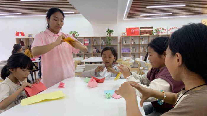 實踐團成員教小朋友折千紙鶴。毛蘭蘭攝
