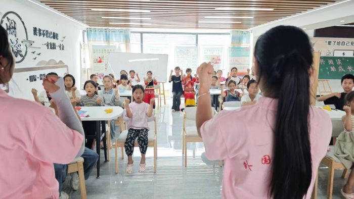 實踐團成員教小朋友們跳手勢舞。李玉霞供圖