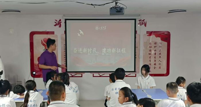 在進行系列參觀、調研活動之后,“沭火新光”宣講團成員帶著實踐收獲與理論思考,將實踐成果轉化為面向不同群體的宣講實踐。7月8日上午,團隊成員與小樹林支教團攜手聯動,走進臨沂蘭山區向支教團的少年們宣講和分享團隊在此次實踐活動中的感受與成果。
