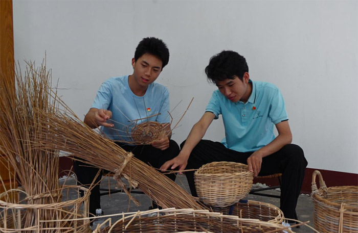 圖為隊員體驗柳編工藝制作張舒桐攝