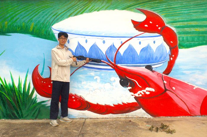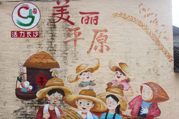 三聯村,這里的“稻蝦共生”生態農業基地實現一水兩用、一田雙收。村中墻上的彩繪生動再現了“稻蝦共生”的特色。