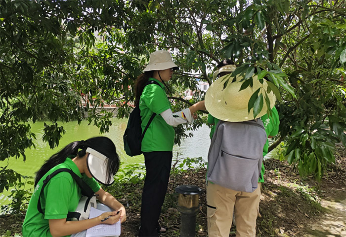 躬身實踐察農情果園深處求真知 7月19日,服務團在雙福村與漏頭村村干部的指引下,深入當地百年荔枝園開展系統性的病蟲害調查。炎炎烈日下,隊員們采用隨機取樣法,對不同區域的荔枝樹進行全方位觀測:仔細檢查葉片、枝條、果實的健康狀況,詳細記錄炭疽病、荔枝毛氈病、荔枝蝽等病蟲害的種類、分布及危害程度,并同步測量了土壤pH值等環境指標,全面分析影響荔枝樹生長的關鍵因素。過程中,隊員們熟練運用專業工具進行樣本采集與初步病害鑒定,結合環境數據排查潛在誘因,并及時將診斷建議反饋給農戶。隊員們一邊記錄數據,一邊現場指導防控措施,并在現場發放了精心編撰的《病蟲害防治歷》供農戶參考,為農戶提供了及時、實用的技術參考。