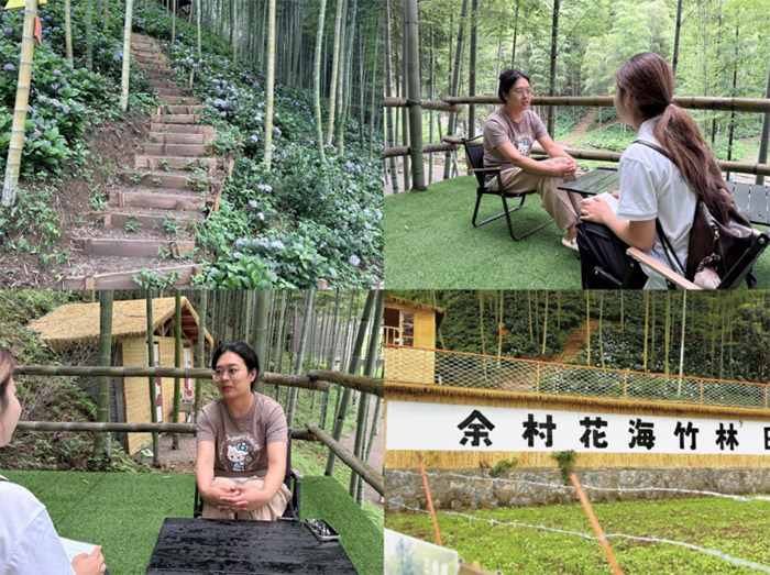 見(jiàn)證青年歸巢,探尋綠色動(dòng)能 當(dāng)實(shí)踐團(tuán)成員們走訪村莊時(shí),真切感受到家鄉(xiāng)的“綠水青山”正成為吸引人才回歸的“黃金賽道”。城鄉(xiāng)規(guī)劃專業(yè)畢業(yè)的俞佳慧便是典型代表。她向成員們分享了自己的創(chuàng)業(yè)經(jīng)歷:回鄉(xiāng)經(jīng)營(yíng)“竹林花海”農(nóng)場(chǎng),不僅收入可觀,更能陪伴家人。她創(chuàng)新性地利用山谷陰涼破解夏季經(jīng)營(yíng)難題,更將修剪的竹枝制成盆栽變廢為寶,帶動(dòng)了村民就業(yè)。在深入交流中,俞佳慧還向成員們?cè)敿?xì)揭秘了余村的“綠色存折”——竹林碳匯交易機(jī)制。成員們了解到,村民通過(guò)守護(hù)竹林獲得碳匯收益,真正實(shí)現(xiàn)了“葉子變票子”,這為實(shí)踐團(tuán)研究綠色鄉(xiāng)村路徑提供了寶貴案例。
