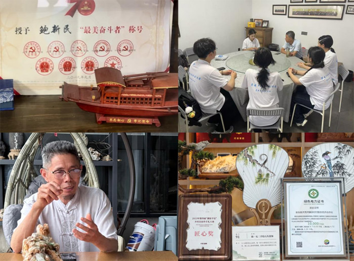 溯源歷史痛楚,感悟理念光輝 實(shí)踐團(tuán)成員們站在余村的青山翠竹間,聆聽(tīng)安吉余村原黨支部書(shū)記鮑先民回溯那段沉重的轉(zhuǎn)型歷程。他向成員們講述,上世紀(jì)九十年代,村里依賴礦山和工廠,環(huán)境遭受?chē)?yán)重破壞,甚至付出了生命的代價(jià)。面對(duì)生態(tài)危機(jī),余村毅然關(guān)停礦山,經(jīng)濟(jì)一度陷入困境。轉(zhuǎn)折發(fā)生在2005年8月15日,成員們了解到,時(shí)任浙江省委書(shū)記考察余村,對(duì)關(guān)礦決策給予高度肯定,首次提出“綠水青山就是金山銀山”的科學(xué)論斷。在后續(xù)的深入走訪中,實(shí)踐團(tuán)成員們來(lái)到了葛元德老人家的“兩山”文創(chuàng)店。這位老礦工撫摸著店內(nèi)一塊斑駁的礦石樣本,向成員們生動(dòng)描述了當(dāng)年粉塵蔽日、下礦如搏命的艱辛歲月。更讓成員們深受觸動(dòng)的是他兒子的選擇:放棄了在杭州的電子生意,毅然回鄉(xiāng)創(chuàng)業(yè),經(jīng)營(yíng)起這家文創(chuàng)店,將父親利用廢棄礦石精心雕刻的石刻藝術(shù)品和盆景推向市場(chǎng),讓冰冷的廢石重獲藝術(shù)新生,成為生態(tài)價(jià)值轉(zhuǎn)化的鮮活例證。