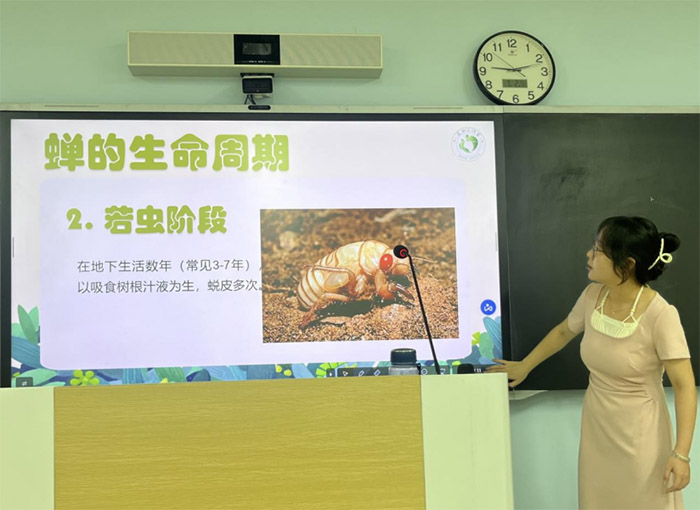 上午的課程圍繞蟬的科普知識(shí)展開。團(tuán)隊(duì)成員小燁老師通過幻燈片圖片與視頻生動(dòng)講解蟬從樹枝產(chǎn)卵到地下蟄伏數(shù)年,再到成蟲羽化的蛻變歷程。隨后,隊(duì)員向?qū)W生們細(xì)致解析蟬的身體結(jié)構(gòu),用示意圖展示復(fù)眼、翅膀與腹部發(fā)聲器的功能,揭秘“雄蟬振翅鳴唱”的發(fā)聲原理,并對(duì)比蚱蟬、蟪蛄等種類的差異,讓抽象知識(shí)變得觸手可及。