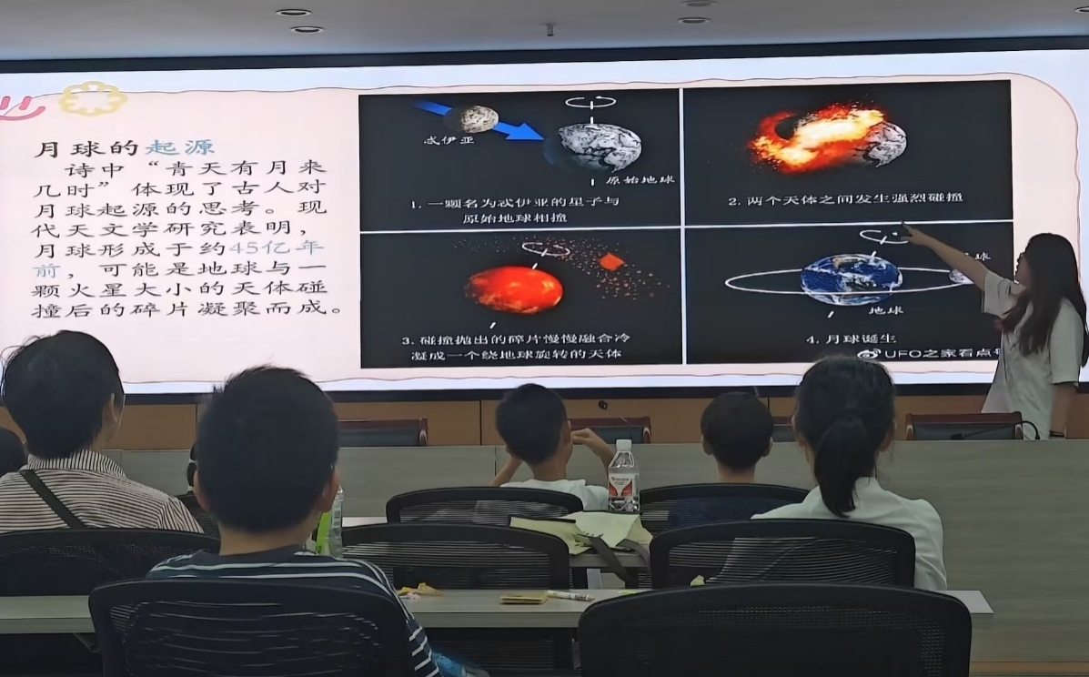 在古詩品讀過程中,周彥宏創造性地融入了月球科學知識的講解。她指出,李白詩中的“青天有月來幾時”正體現了古人對月球起源的思考,進而運用圖片和視頻資料向小朋友們介紹了現代科學對月球形成的幾種主流假說,如大碰撞假說、分裂假說等。當她通過展示登月照片時,小朋友們紛紛瞪大了眼睛,發出陣陣驚嘆。她還引導小朋友們認識人類從“欲上青天攬明月”的夢想,到1969年阿姆斯特朗首次登月的偉大跨越,這一環節讓小朋友們深刻感受到古詩中蘊含的科學探索精神與現代科技成就的呼應。