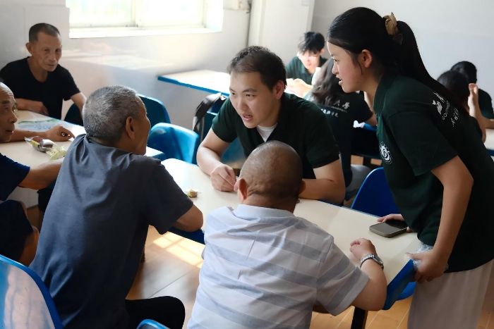 在一樓食堂,實踐隊開展了防詐騙宣講。針對老人們容易遇到的“保健品詐騙”“冒充親友借錢”等騙局,隊員們用方言講解真實案例,提醒老人“不輕信、不轉賬、不貪小便宜”。為了讓老人們更容易記住,隊員們還編了順口溜:“陌生電話要警惕,中獎退稅是騙局;看病買藥找醫院,路邊推銷不可信!”老人們聽得認真,有的還主動分享自己遇到的詐騙經歷,現場互動熱烈。