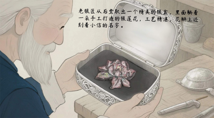 圖為繪本內頁“老銀匠取出銀蓮花”場景。馬凱旋 供圖