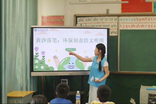 當日上午的環(huán)境保護教育以 “黃沙落筆:環(huán)保創(chuàng)意繪文明圖” 為主題,支教隊員從地球生態(tài)面臨的 “黃沙侵襲” 問題切入,通過視頻短片展示了土地荒漠化、塑料污染等環(huán)境現(xiàn)狀,讓孩子們真切感受到生態(tài)保護的緊迫性。課堂上,隊員們引導小朋友們圍繞日常環(huán)保做法展開熱烈討論,從 “隨手關燈” 到 “垃圾分類”,一個個樸素答案的背后,是孩子們對 “守護家園” 的初步認知。隨后,隊員們系統(tǒng)講解了環(huán)境保護的重要意義和具體舉措,并借助趣味知識問答鞏固所學。