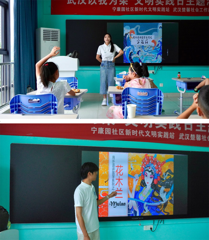 七月流火,熱力不減。7月22日,江漢大學外國語學院“青葵”志愿服務團如約走進武漢市寧康園社區,為社區的孩子們帶來了精彩紛呈的“外語講國學”系列課程。繼水木清華社區活動后,“青葵”團隊持續以“外語講國學、美育潤童心、紅色鑄根魂、科技創未來”為主線,深化“高校—社區—家庭”協同育人網絡,將語言文化的魅力播撒至更多童心。
