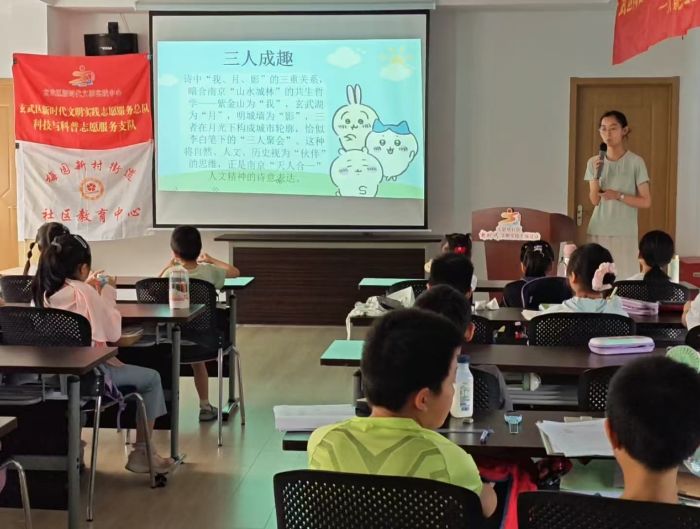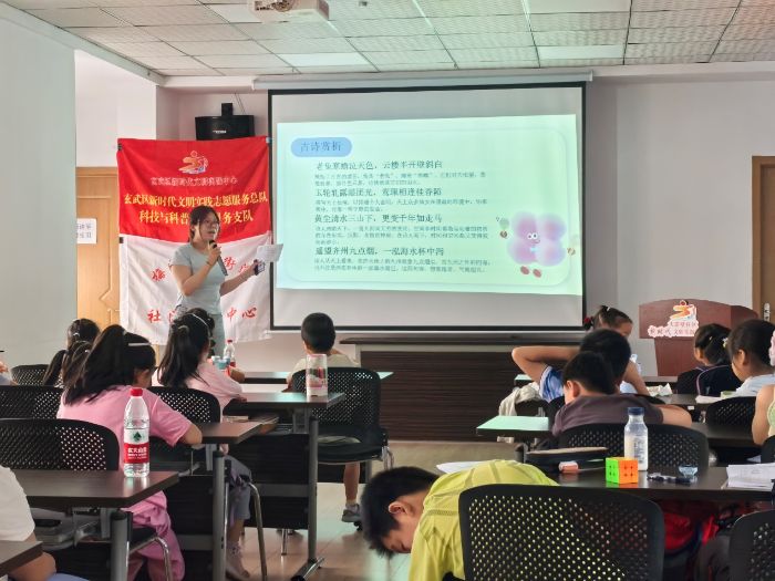 2025年7月20日,南京師范大學(xué)泰州學(xué)院人文傳媒學(xué)院“詩韻探行,雅句傳薪”暑期社會(huì)實(shí)踐團(tuán)隊(duì)走進(jìn)南京市大影壁社區(qū)黨群服務(wù)中心,面向小學(xué)生群體開展了一場沉浸式的詩詞鑒賞課。團(tuán)隊(duì)成員以李白《月下獨(dú)酌》與李賀《夢天》為切入點(diǎn),通過趣味漫畫講解和互動(dòng)探討,引導(dǎo)孩子們感受詩歌魅力,體會(huì)古今情感的共鳴。