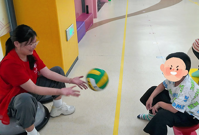 在活動訓練課上,“星語心述”團隊成員作為助教,與孩子們一起進行拋球注意力訓練、平衡練習等活動。在互動過程中,隊員們注意到一些特殊的行為表現:有的孩子在拋球時目光固定,既不追蹤球的軌跡,也不與助教對視;有的孩子對老師的指令反應較慢,或短暫執行后便沉浸在自己的世界里。這些觀察讓隊員們更直觀地理解了孤獨癥兒童的社交和注意力特點。