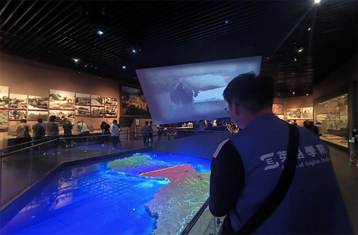 從歷史記憶角度看抗美援朝的歷史,重點就在五大戰役的呈現上。館內浸透歷史印記的展品令每一位成員感受到了志愿軍戰士的鋼鐵意志,其中最具有特色的就是通過多媒體投影和聲光電技術復現戰略規劃圖與真實的戰爭場景,不僅生動展現了志愿軍戰士們沖鋒陷陣、奮勇殺敵的動態瞬間,更讓每一位實踐團成員感受到他們保家衛國的無畏與熱血。