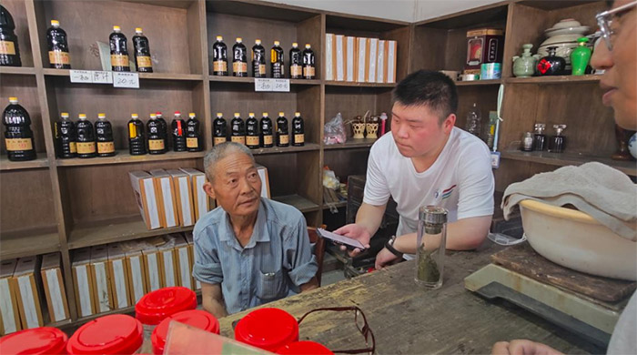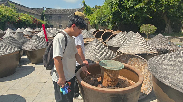 實踐活動的重頭戲是對國家級非遺項目“窯灣甜油”的深度調研。6日清晨,隊員們走進古鎮中始終堅持古法釀造的“趙信隆醬園店”。趙信隆醬園店由鎮江籍商人趙金鏖投資興建,始建于明天啟三年(1623年),距今已有394年的歷史,是窯灣“前店后坊”布局模式的典型代表之一,初建時擁有800余口缸,經營甜油、醬油、醋等產品。清末民國初年,醬園店在南京、鎮江、揚州開設分店,甜油瓶貼有“伏醬秋油”商標。建筑南北四進院落,青磚小瓦樓房保存良好,門匾懸掛“黑醬自黑非墨染,甜油微甜是蜜香”對聯。