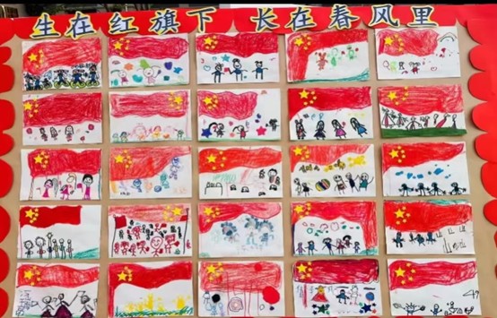 “生在紅旗下,長在春風里”,孩子們以畫筆為媒,繪出對紅色信仰的理解。一幅幅作品鋪滿展示墻:稚嫩筆觸勾勒的五星紅旗,在藍天白云下迎風招展;簡筆繪就的英雄群像,圍繞紅旗訴說著守護與熱愛。每一筆色彩、每一個圖案,都是孩子們對紅色精神的直觀表達,讓 “崇敬” 二字,在畫紙上開出爛漫的花。