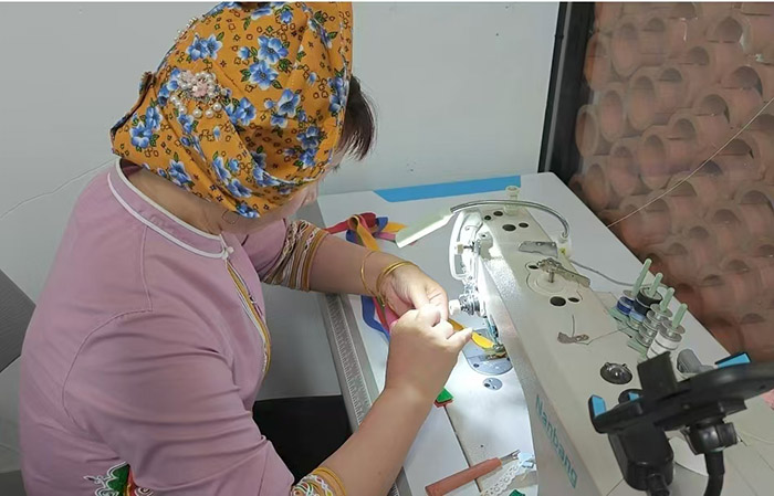 實(shí)地調(diào)研,挖掘服飾內(nèi)涵 實(shí)踐團(tuán)奔赴惠安縣小岞鎮(zhèn),這里是惠女服飾文化的重要發(fā)源地之一。團(tuán)隊(duì)先后走訪了李開白女士的惠女服飾制作工作室、小岞美術(shù)館的惠女服飾文化體驗(yàn)館以及李麗英女士的海娘子惠女服飾工作室。在李開白女士的工作室中,實(shí)踐團(tuán)成員與李開白女士談及“牡蠣里”品牌,一方面了解到“牡蠣里”現(xiàn)代設(shè)計(jì)理念和改進(jìn)工藝的引入,一方面學(xué)習(xí)體悟李開白女士不失傳統(tǒng)精髓改革的大膽精神。緊接著到小岞美術(shù)館的惠女服飾文化體驗(yàn)館,豐富的展品和詳實(shí)的資料讓實(shí)踐團(tuán)成員們對(duì)惠女服飾的發(fā)展歷程有了更全面的了解。從古代閩越遺俗與海洋文化、中原文化碰撞交融的起源,到各個(gè)歷史時(shí)期服飾樣式的演變,成員們仿佛穿越時(shí)空,見證了惠女服飾的興衰榮辱。而在李麗英女士的海娘子惠女服飾工作室里,實(shí)踐團(tuán)成員們近距離觀察到了惠女服飾的制作過程。從一針一線的縫補(bǔ),到色彩搭配的精心考量,每一個(gè)環(huán)節(jié)都蘊(yùn)含著深厚的文化底蘊(yùn)。