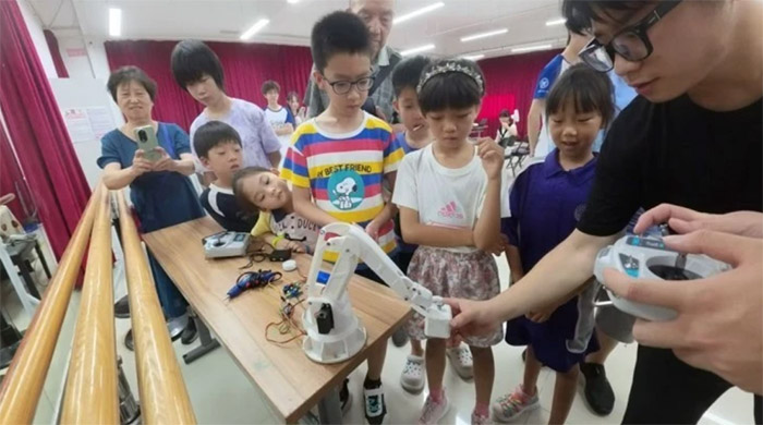圖為科創(chuàng)星光實(shí)踐團(tuán)向孩子們演示機(jī)械臂的操作