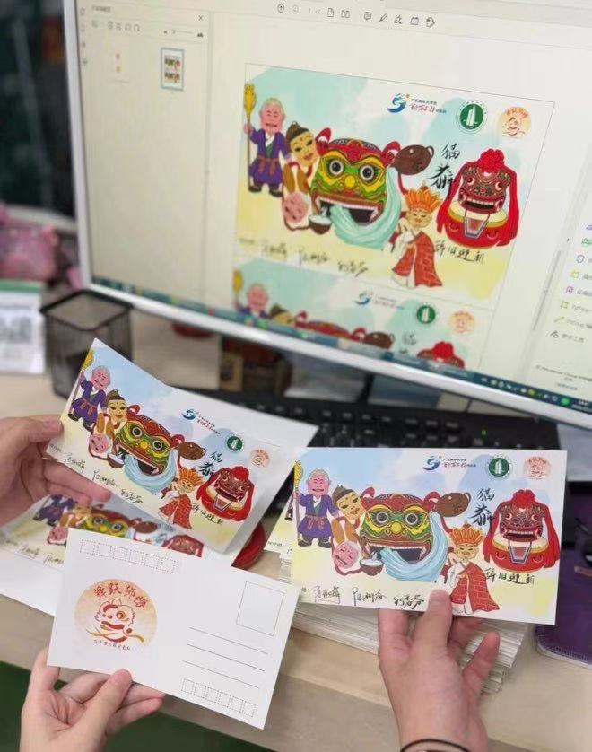 圖為"舞躍獅騰"繪畫組融合高埔崗貓頭獅相關(guān)文化制作的明信片 陳柳媚攝