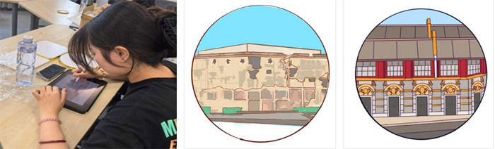 團(tuán)隊(duì)成員以數(shù)智為橋,用AI繪圖軟件和Procreate電子繪圖軟件復(fù)刻中共一大會(huì)址木窗紋路、四行倉庫彈痕墻面等,將團(tuán)隊(duì)成員留下足跡的紅色地標(biāo)細(xì)節(jié)轉(zhuǎn)化為琺瑯畫稿,讓更多人清晰“看見”歷史,讀懂當(dāng)代青年講述的紅色故事。