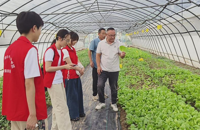 (圖為辛江智慧農(nóng)業(yè)負(fù)責(zé)人帶實(shí)踐團(tuán)參觀智慧大棚)