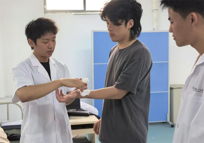 實踐團成員分組進入外科換藥室與急診科學習,在外科換藥室,醫護人員結合兒童常見創傷案例,詳細講解了“八字纏繞法”等包扎技巧的操作要點:關節處傷口先覆無菌紗布,再以繃帶‘8’字形交叉纏繞,松緊度以插入一指為宜,兼顧止血與血液循環。成員們兩兩一組,用模擬傷口模型反復練習,醫護人員在旁細致指導,不時糾正纏繞角度、力度等細節。李朔杰在操作時,因第一圈斜度沒掌握好導致繃帶松動,護士當即示范調整:“順著關節弧度纏才穩。”他練習后感慨:“原以為簡單,實操才知細節關鍵,多虧老師指導。”