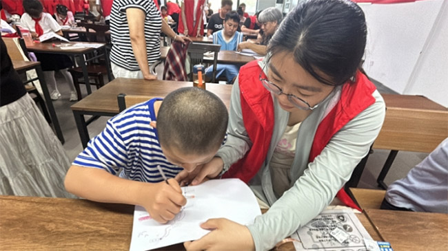 隊員在社區(qū)服務(wù)中心指導(dǎo)小朋友完成手工