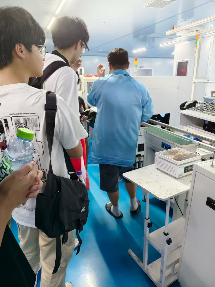 走進生產(chǎn)車間,才是真正觸摸到智能制造的 “心臟” 。藍色的地面、有序排列的自動化設(shè)備,還有專注操作的技術(shù)人員,構(gòu)成一幅充滿科技感與實干氛圍的畫面。我們跟在講解人員身后,看著智能生產(chǎn)線如何精準(zhǔn)運行,從原材料輸入到成品產(chǎn)出,自動化、智能化的流程,將效率與精度完美融合。那些在課堂上學(xué)過的傳感器、編程控制、工業(yè)互聯(lián)網(wǎng)知識,不再是書本上的概念,而是化作眼前流暢運轉(zhuǎn)的機械臂、精準(zhǔn)無誤的檢測系統(tǒng),實實在在地 “活” 了起來 。