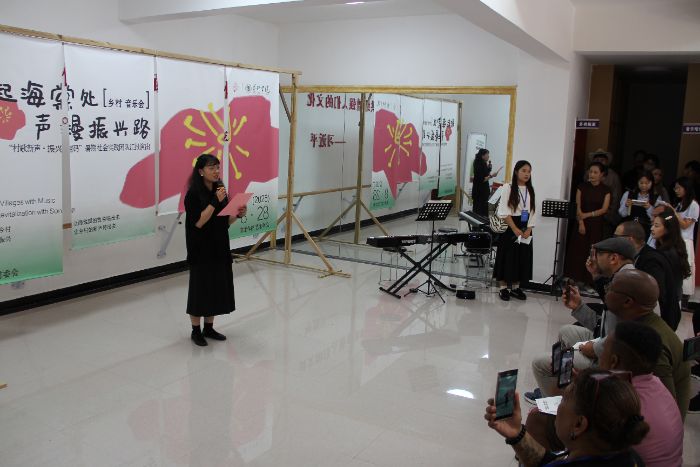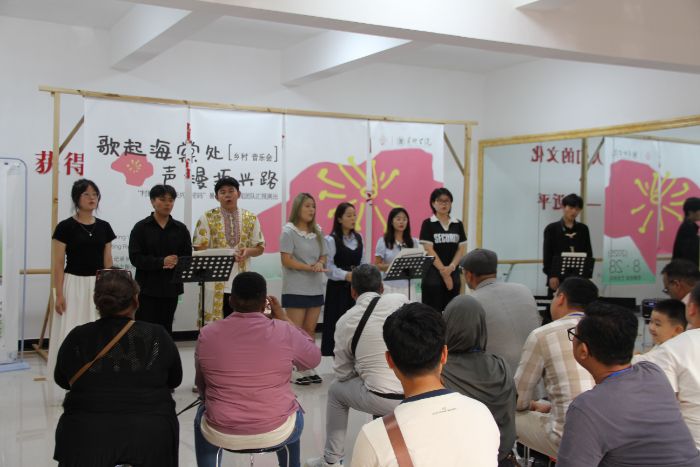 鄉(xiāng)村音樂會上,團(tuán)隊創(chuàng)作的村歌《心海棠》以“青山疊翠屏,稻田半蛙鳴”描繪鄉(xiāng)土自然之美,以“舊路鋪新石,電線架云端”展現(xiàn)發(fā)展變遷;《海棠夢》則節(jié)奏明快、充滿希望,勾勒出鄉(xiāng)村振興的未來圖景。整場演出以原創(chuàng)村歌為主線,融合民歌新編、民族舞蹈、中西器樂演奏,并設(shè)置“擊鼓傳花”互動環(huán)節(jié),吸引來自7個國家的20余位國際友人、國內(nèi)多所高校駐村書記與本地村民共同參與,真正實現(xiàn)了“藝術(shù)無國界,文明共欣賞”。在不同膚色的觀眾手中傳遞的不僅是玩具,更是文化互鑒、友誼共生的象征。