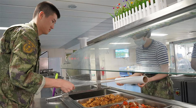 圖為海軍軍醫(yī)大學學員在進行用餐前的準備工作