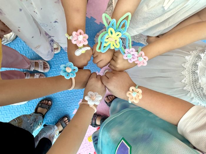 隨后的扭扭棒手工課充滿歡聲笑語。隊員們耐心指導,手把手教孩子們制作個性眼鏡。五彩的扭扭棒在孩子們手中變成了創意無限的作品,不僅鍛煉了他們的動手能力,還激發了藝術創造力。